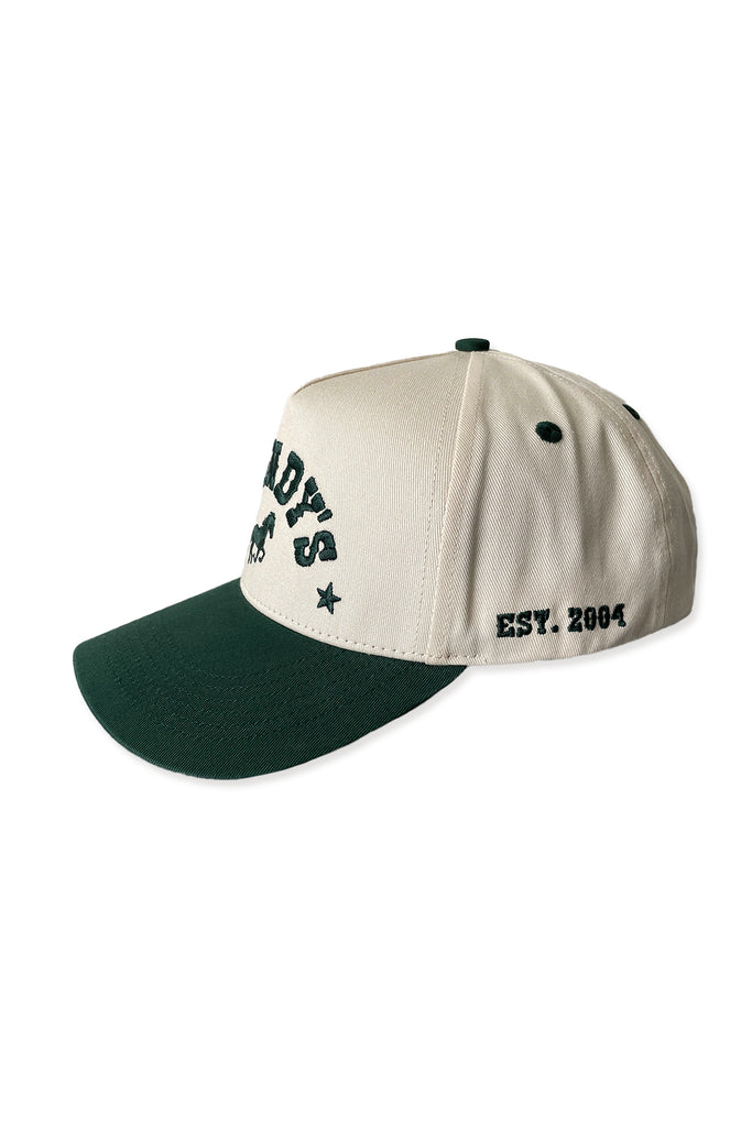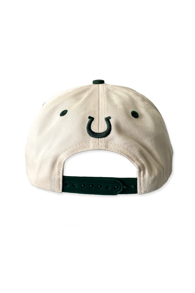 Cette casquette “Trucker” bicolore vert et crème est ornée d'un cheval au galop brodé sur le devant et d'un fer à cheval porte-bonheur à l'arrière. Fabriquée en 100% coton et dotée d'un ajustement à l'arrière pour un maintien parfait, elle est la touche finale idéale pour un look décontracté, prêt pour le ranch.
