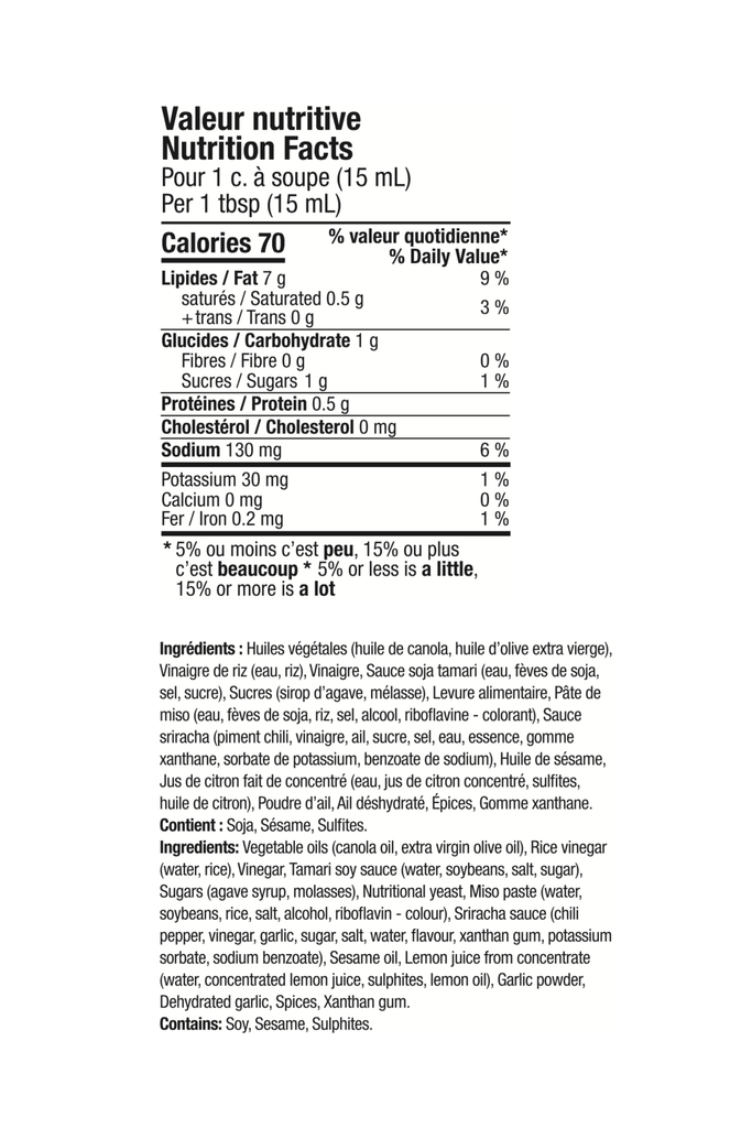 Notre vinaigrette d'Été propose un mélange savoureux de riches nuances d'umami qui raviront vos papilles gustatives. Composée de miso, de tamari et de gingembre, cette sauce ajoutera une touche délicieuse et rafraîchissante à toutes vos salades estivales.