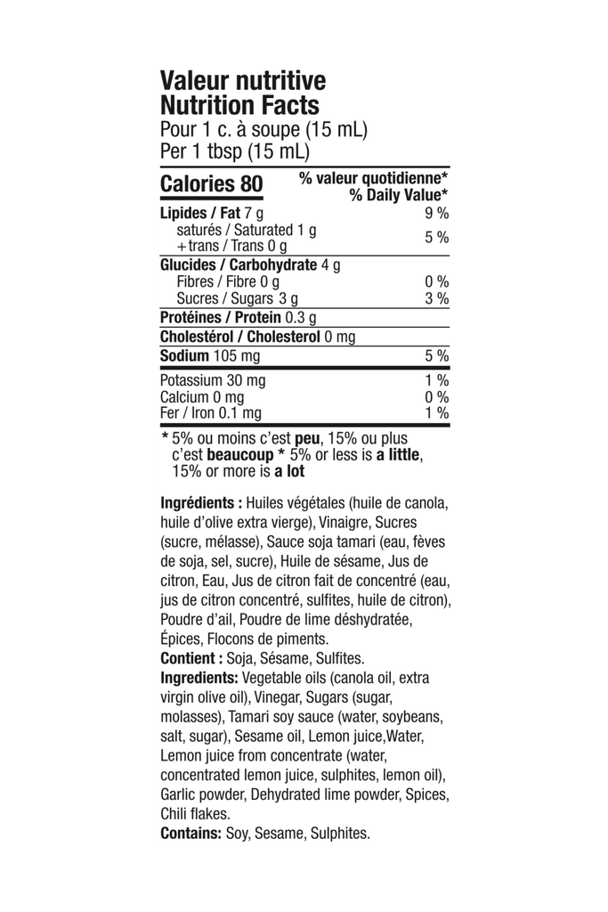 Si vous aimez notre vinaigrette au Sésame, vous allez certainement adorer notre vinaigrette au Sésame et Agrumes. Elle marie parfaitement le goût vif des agrumes à la richesse soyeuse du sésame. Cette sauce rehaussera n'importe quelle salade par sa saveur vibrante!