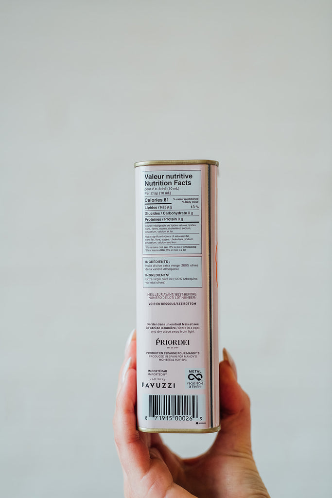 Our newest addition to the Mandy's pantry staples, our 100% extra virgin olive oil! Crafted in the beautiful mountains of The Serra de Montsant Natural Park in Spain, the olives are handpicked and crushed the same day to produce an intense and rich olive oil that is perfectly balanced. Perfect as a fresh salad dressing, drizzled over heirloom tomatoes or a pasta dinner.